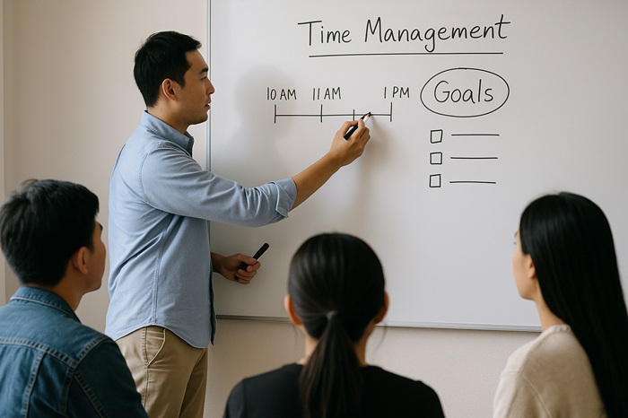 Nội dung thực tế: Bao gồm cách lập kế hoạch ngày/tuần/tháng, quản lý ưu tiên, kỹ thuật Pomodoro, chống trì hoãn và tổ chức công việc.